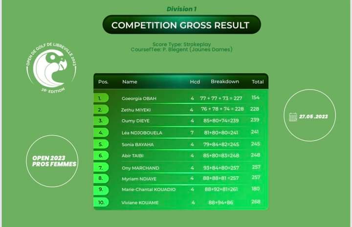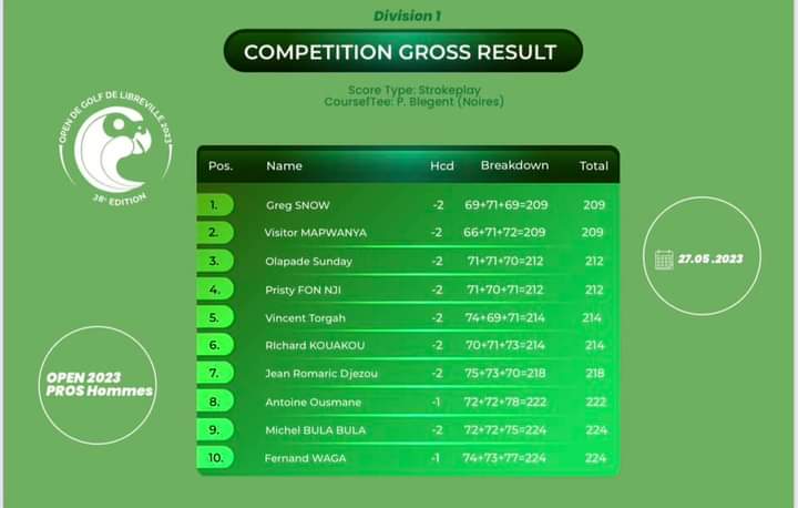 Chez les professionnels :- Hommes: Greg Snow a su se démarquer et sortir le grand jeu afin de battre la concurrence et remporter cette 38ème Édition ;- Femmes : c’est la Sud africaine Zethu MIYEKI qui a remporté le premier prix féminin du First Libreville Women’s Open de cette 38ème Édition.