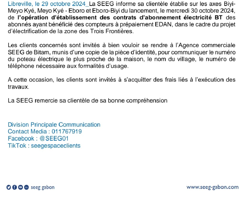 La SEEG informe sa clientèle établie sur les axes BiyiMeyo Kyé, Meyo Kyé – Eboro et Eboro-Biyi du lancement, le mercredi 30 octobre 2024, de l’opération d’établissement des contrats d’abonnement électricité BT des abonnés ayant bénéficié des compteurs à prépaiement EDAN, dans le cadre du projet d’électrification de la zone des Trois Frontières.